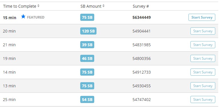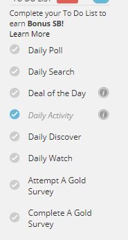The daily poll is one question that gets you 1SB. The daily search just opens a search bar which also gets you 1SB. Deal of the day gets you to buy something. Daily discover does the same. Daily watch just takes you to the video watching page. The survey links take me to some surveys, and there are actually some today that you can’t be disqualified from so I did a 15 minute survey for 60sbs. I somehow managed to get disqualified from this survey lol.