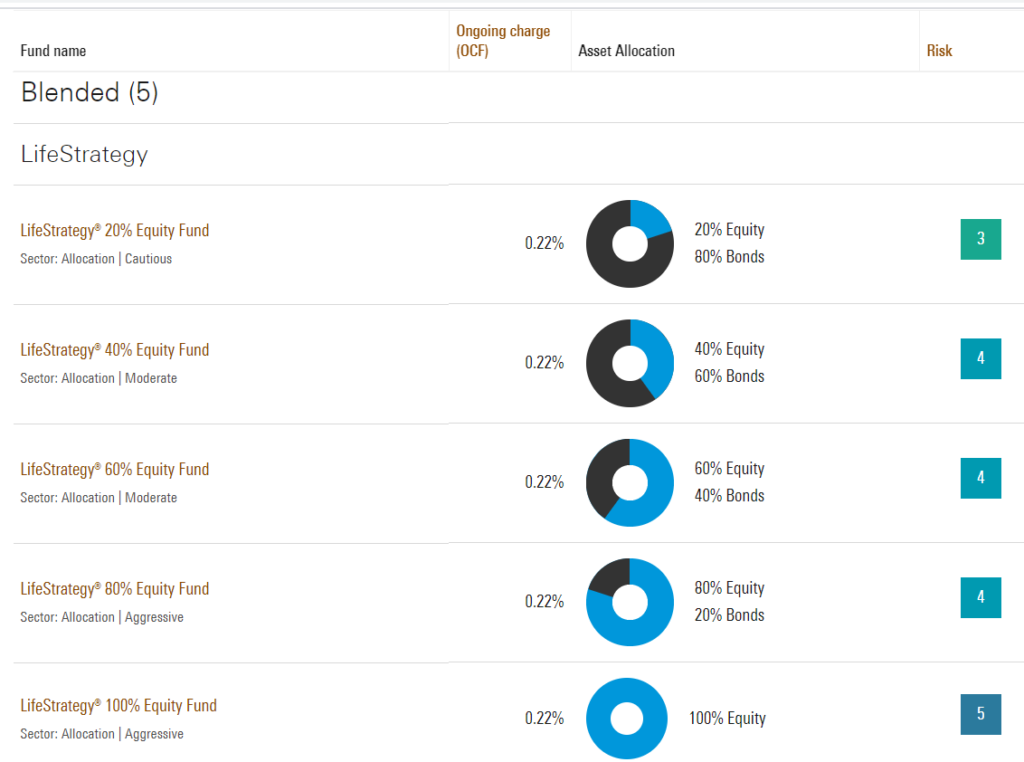 I’m all about simplicity so I love the lifestrategy funds – these are pools of index funds set up for where you are on your investing journey. The fees are slightly higher but these are done for you diversified investment portfolios. The weighting of equities tallies to the rate of risk. Typically, younger long term investors can have a higher weighting in equities as they have longer time frames. Investors tend to want more stable income in later life and bonds provide this.